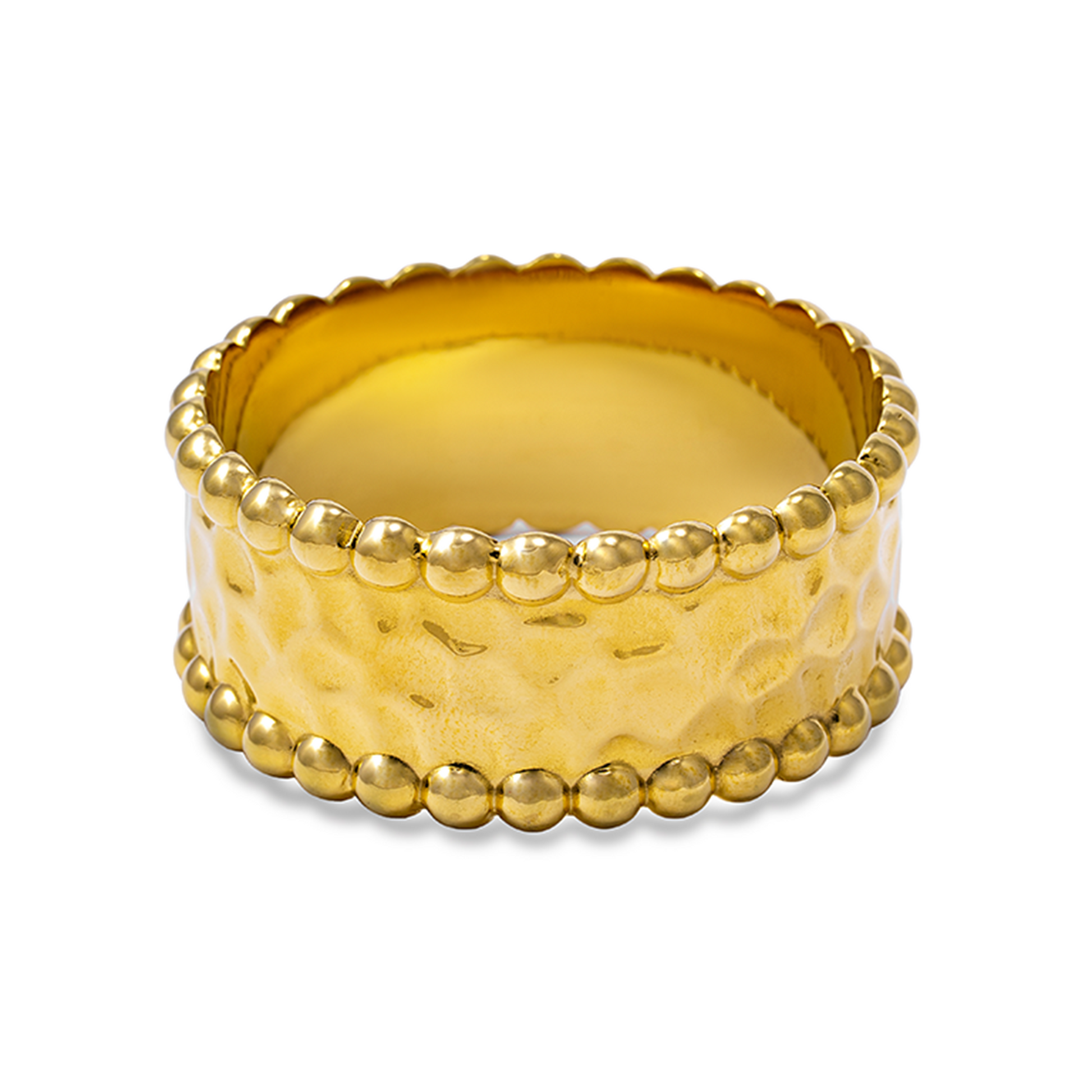 The Taylor Bangle is Loudie’s boldest expression of texture and symmetry. With a wide, hammered band wrapped between two full rows of polished spherical studs, this piece commands attention without compromising elegance. The tactile contrast between the soft gleam of the beads and the rugged surface beneath makes it feel powerful yet refined.